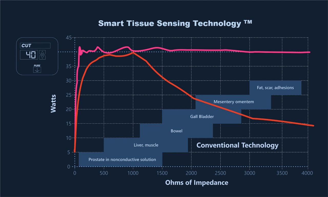 This technology dynamically varies the high-frequency current and voltage which lead to enhanced performance using low power setting resulting in reduced tissue damage and faster recovery.